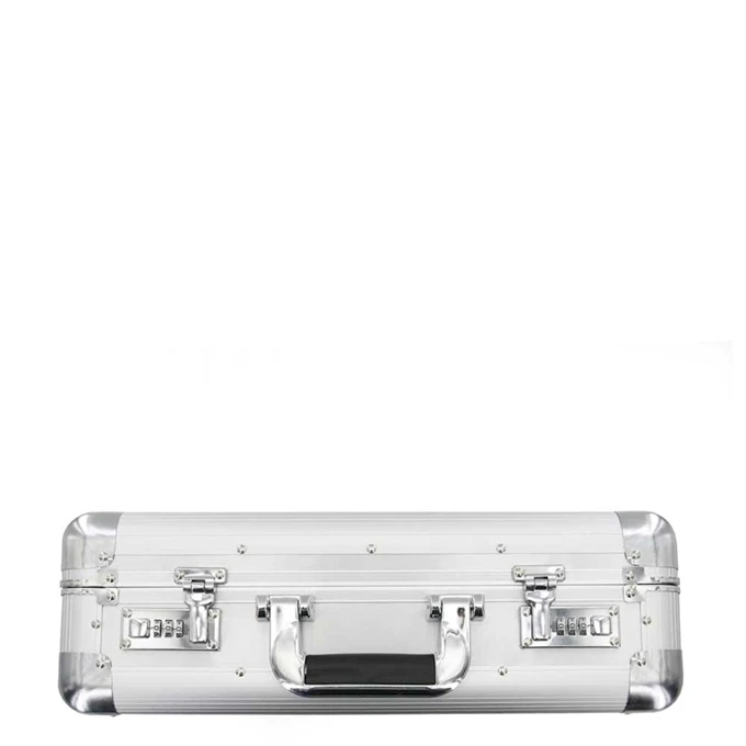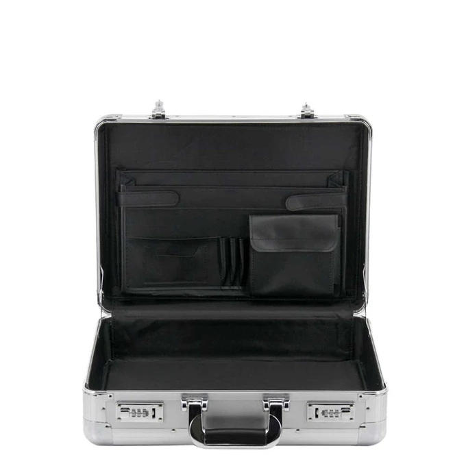 Deze stijlvolle aluminium attache koffer onderscheidt zich door zijn ruim hoofdcompartiment. De koffer is voorzien van metalen hoeken voor extra stevigheid en tevens goede bescherming. De binnenzijde is bekleed met zwart textiel en in het deksel is een praktische organizer verwerkt met twee verstelbare A4- steekvakken, 3 pennenvakken en een extra opbergvakje met klittebandsluiting. Twee stevige uitzetters zorgen ervoor dat het deksel goed open blijft staan.